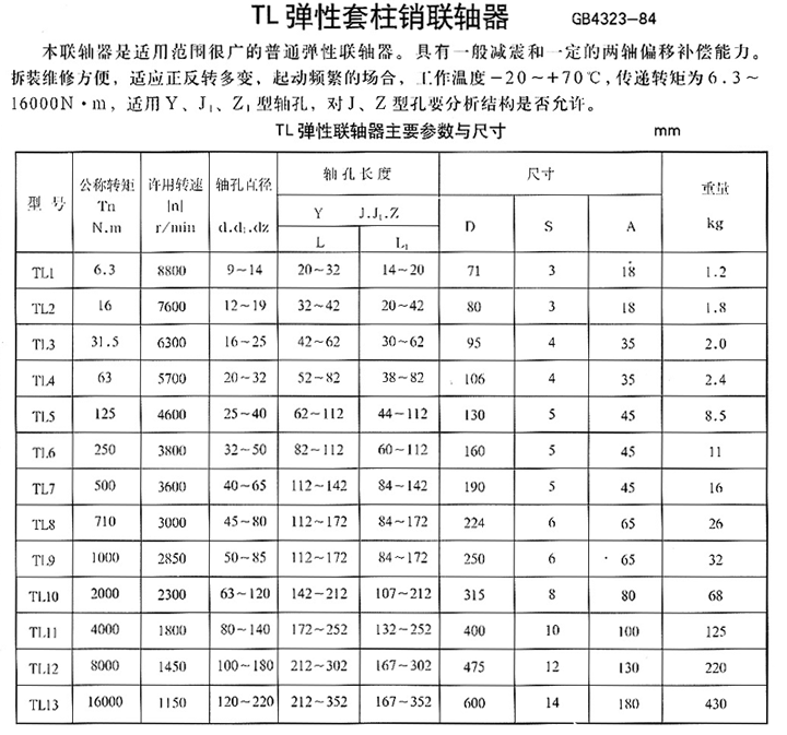 LT型(原TL型)彈性套柱銷聯(lián)軸器(GB4323-2002代替GB4323-1984)彈性套柱銷聯(lián)軸器是利用一端套有彈性套(橡膠材料)的柱銷,裝在兩半聯(lián)軸器凸緣孔中,以實(shí)現(xiàn)兩半聯(lián)軸器的聯(lián)接。彈性套柱銷聯(lián)軸器曾經(jīng)是我國(guó)應(yīng)用 廣泛的聯(lián)軸 器,早在 20 世紀(jì) 50 年代末期即已制訂為機(jī)械部標(biāo)準(zhǔn), JB08 — 60 彈性圈柱銷聯(lián)軸器,是我國(guó) 個(gè)部標(biāo)準(zhǔn)聯(lián)軸器。