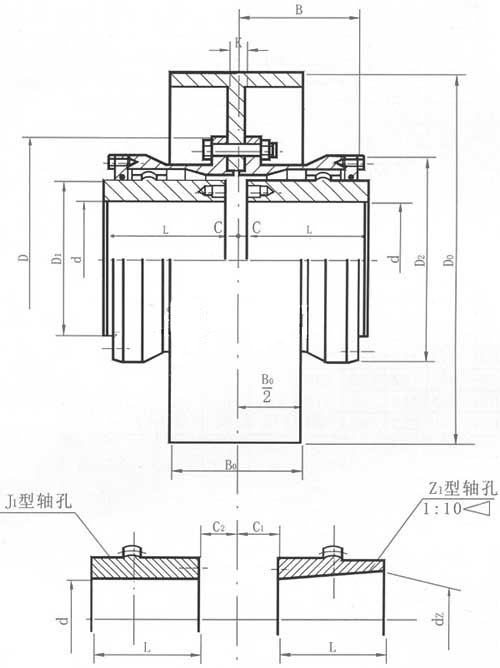 | 注:1、質(zhì)量與轉(zhuǎn)動慣量是按 大直徑的Y軸孔計算的近似值,未計算制動輪。 2、錐型軸孔 大軸徑至220mm。 3、不同制動輪直徑的C、C1、C2植為表中數(shù)值再加K/2,k值見表4.11 |